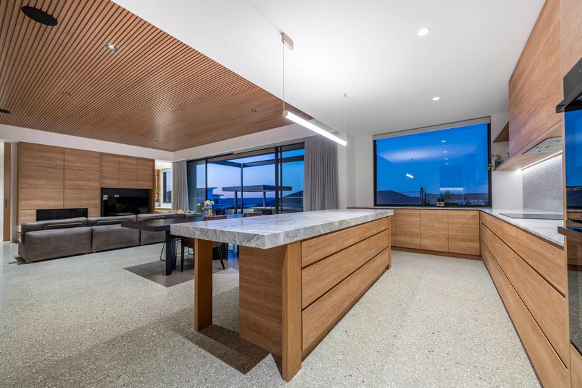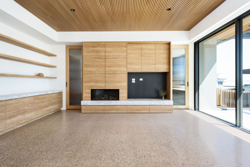 Polished concrete and an elegantly kitchen are offset by the warming tones of the timber, blackbutt joinery and a fireplace