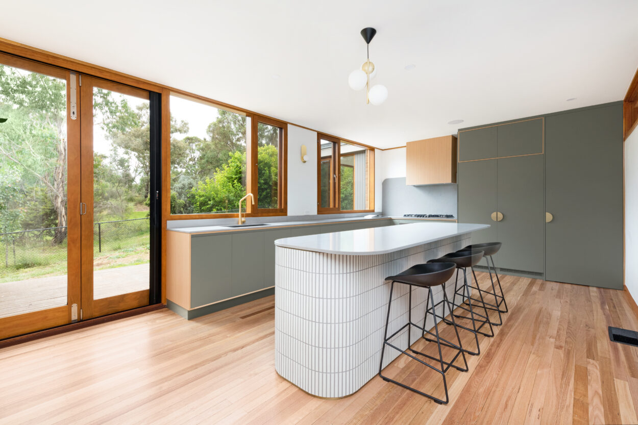 Internally, the most striking material is the custom timber windows, so rarely seen in houses these days. The windows frame the garden and bush setting beyond, whilst also providing excellent thermal performance and functionality.