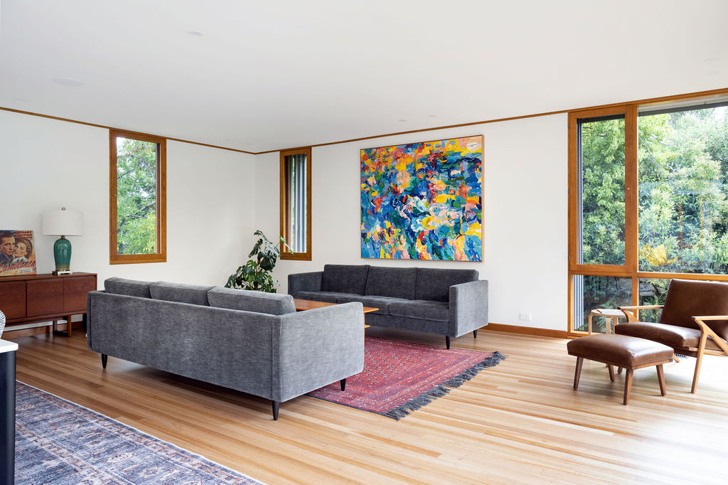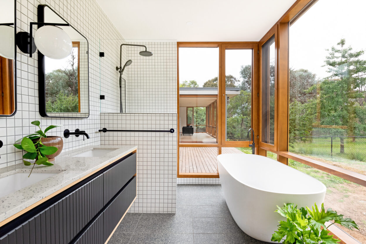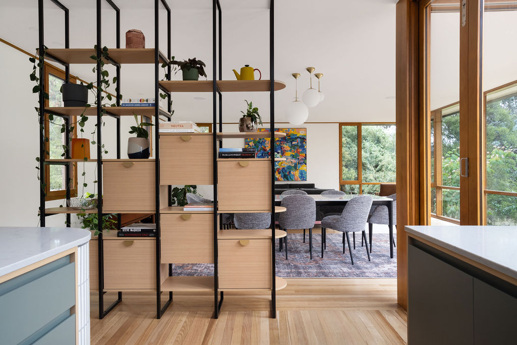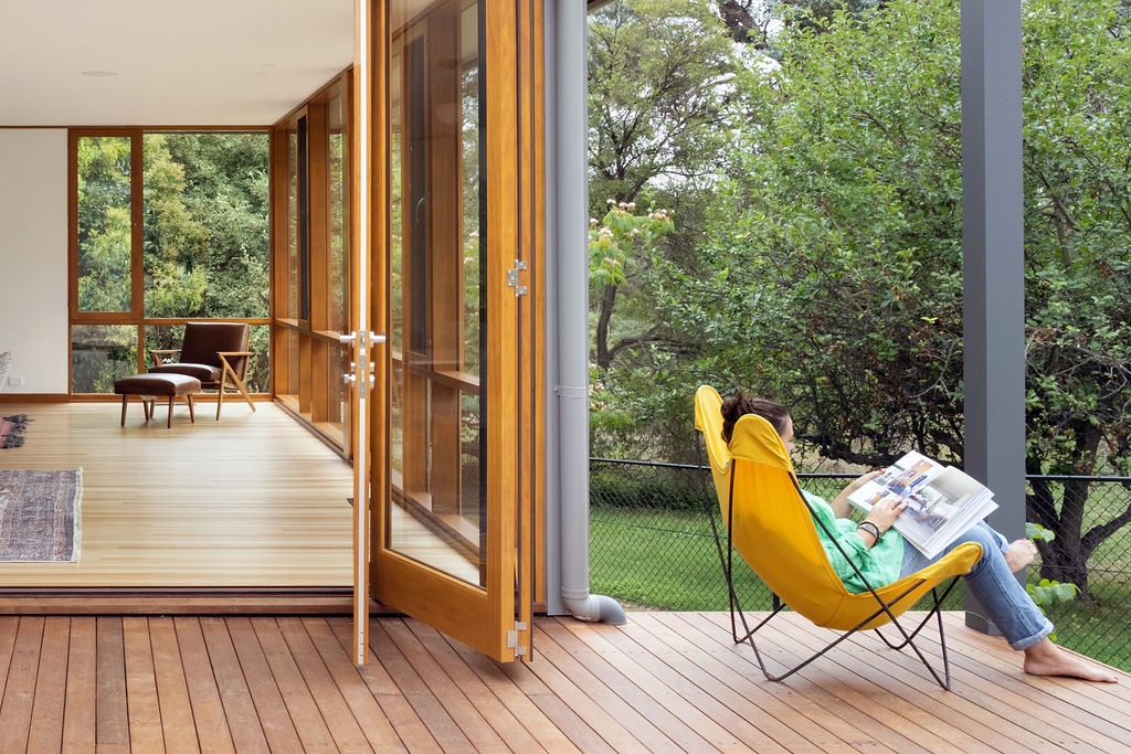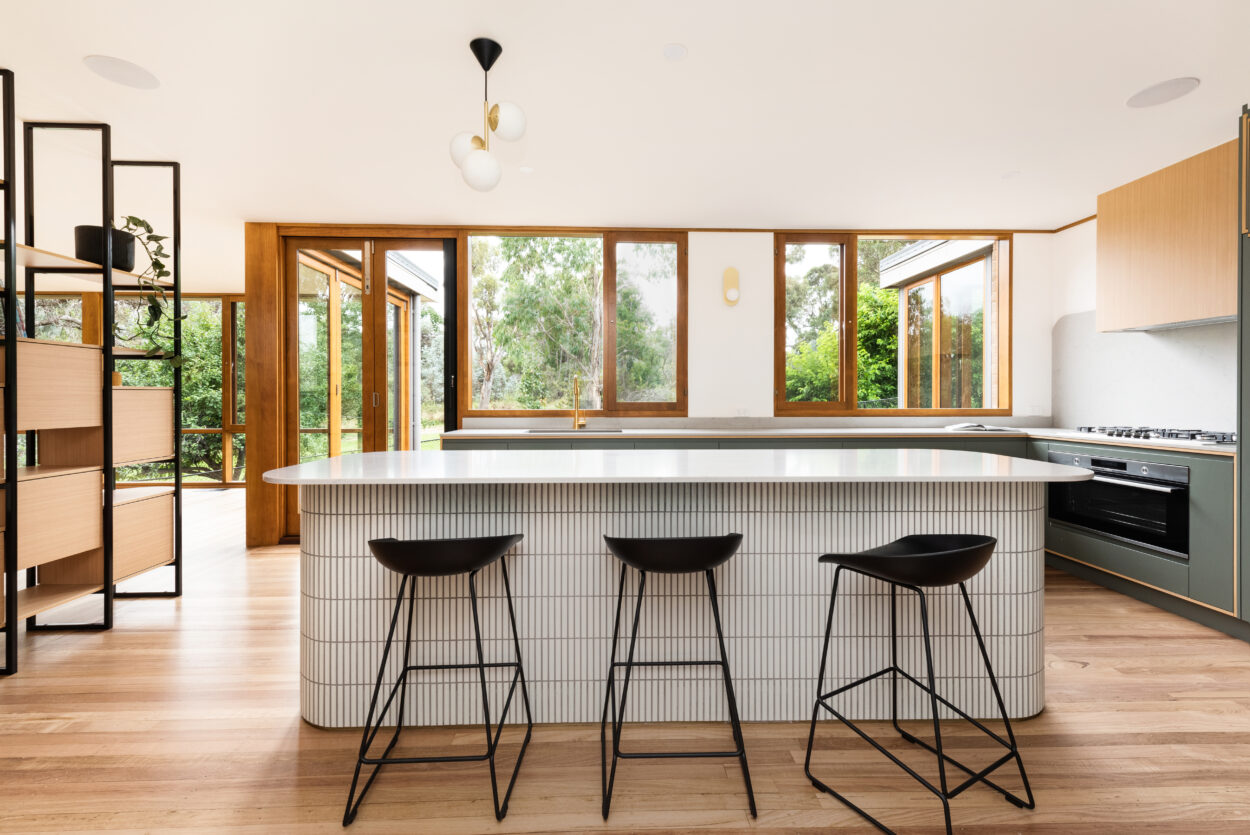Internally, the most striking material is the custom timber windows, so rarely seen in houses these days. The windows frame the garden and bush setting beyond, whilst also providing excellent thermal performance and functionality.