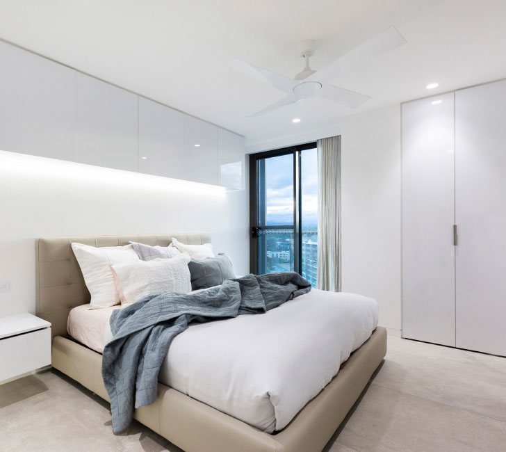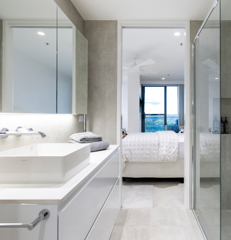 The segregated main bedroom also opens onto the balcony, features a high end walk in dressing room, a luxurious ensuite complete with a freestanding bath to soak away the day and full height corner windows to draw in the view. The other 2 bedrooms are housed in their own wing complete with full bathroom including a separate bath and a powder room, perfect for visitors or your children. There’s plenty of carefully considered storage throughout, ducted reverse cycle heating/cooling for year round comfort, stunning large tiles throughout