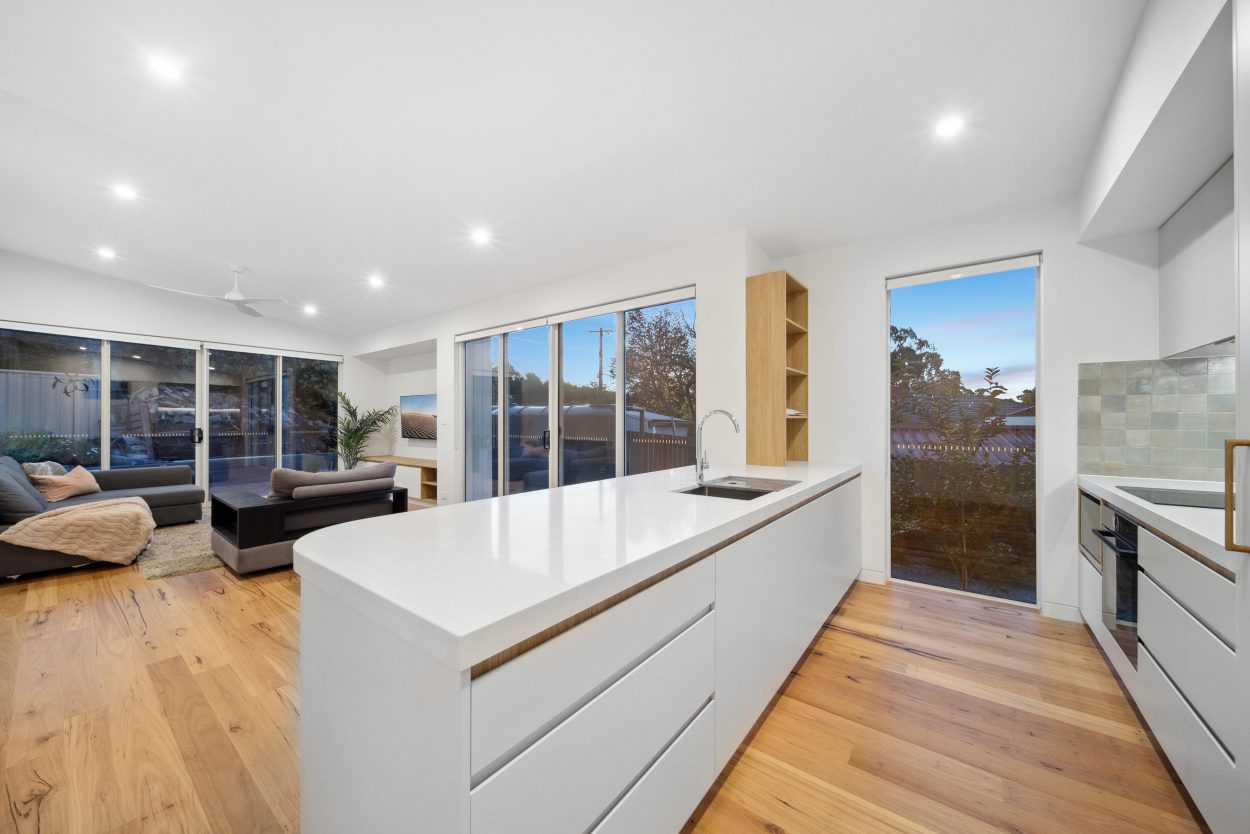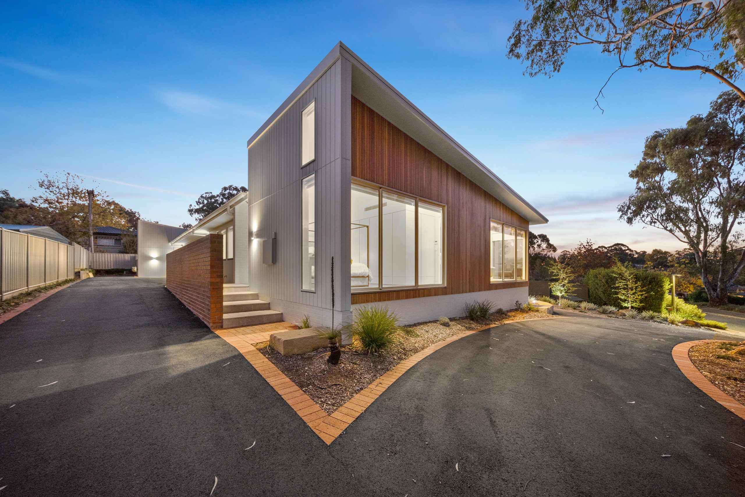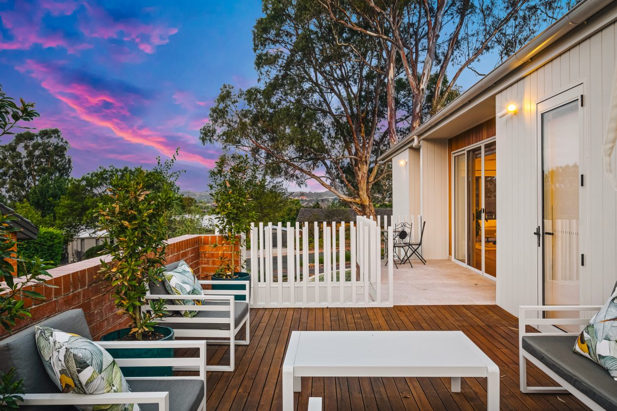The home’s north-facing orientation captures peaceful views over Woden and floods the interiors with natural light. High-quality finishes throughout include engineered Blackbutt timber flooring, stone benchtops in kitchens and bathrooms, and premium appliances such as Miele and Bosch induction cooktops and ovens. Living areas are enhanced with modern comforts like double-glazed windows, and electric blinds
