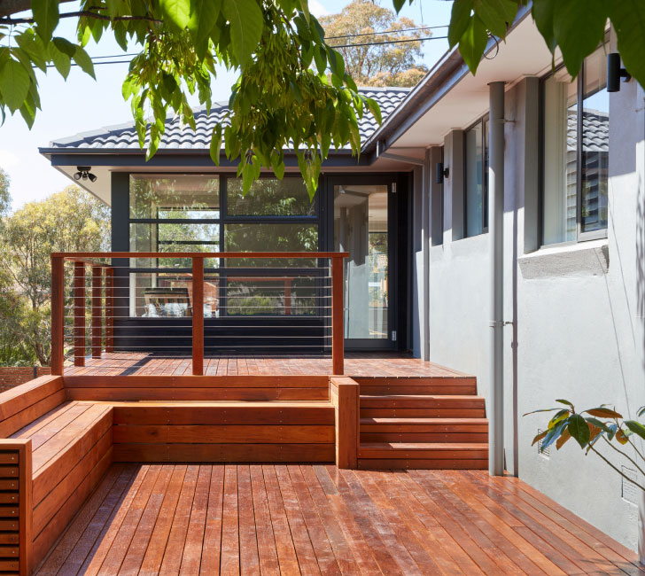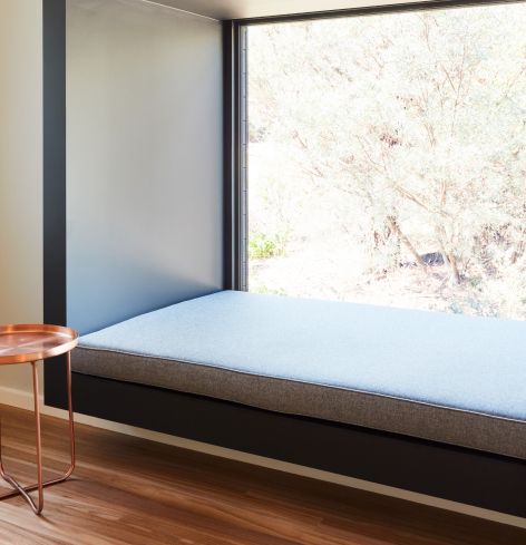 A mid-century style home, whereby the central part of the home would become a welcoming bridge between the front public gardens and the private rear yards. From the moment you move beyond the entry room, your eyes are immediately drawn to the generous back deck and yard beyond. A daybed window set and clerestory windows were introduced in the central area of the home which allows for your eye to move around the room following the light, the family wanted to introduce ample space for displaying artwork and books.